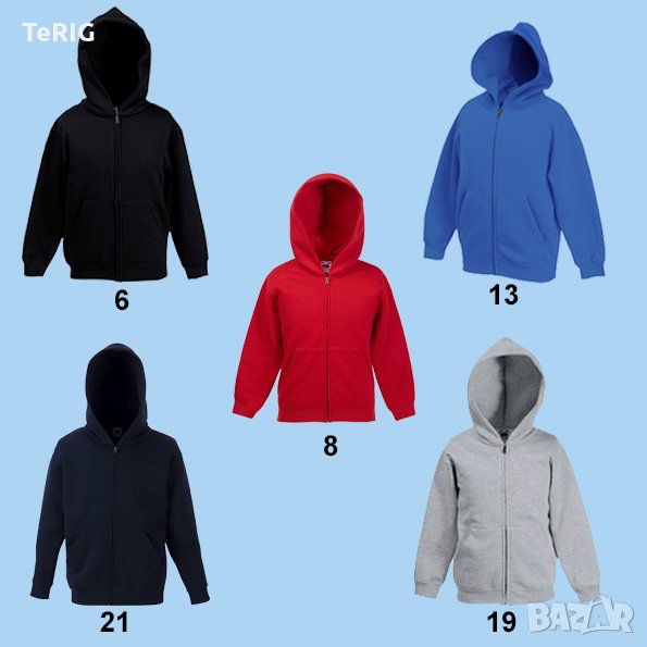 Плътност: 280гр./м2.Производител: Fruit of the Loom. Размери:5-6 год. 41.0 x 50.0 см.;7-8 год. 43.5 x 55.0 см.;9-11 год. 46.0 x 60.0 см.;12-13 год. 51.0 x 65.0 см.;14-15 год. 56.0 x 71.0 см.