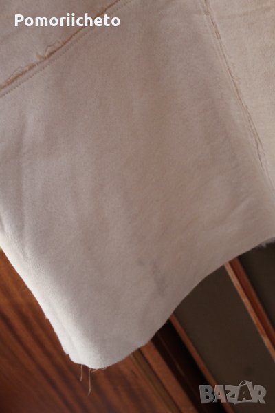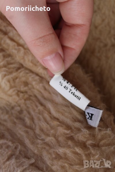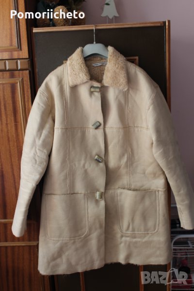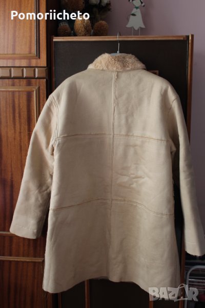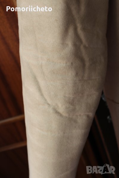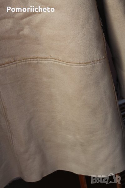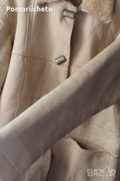Класически модел палтенце в много приятен светъл цвят. Имитация на кожа. Леко, меко и приятно. Има малки забележки (малки потъмнели места), които съм заснела на последните снимки. От задната страна на палтото са, в долните два края, не са особено очевидни при носене. На единият ръкав има същата забележка (на лакътя). Възможно е да може да се почисти, не съм пробвала. Подходящо за размер М и по-малък Л.