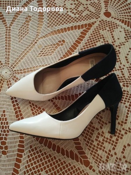 Елегантни обувки Зара в бяло и тъмно синьо, номер 39-40 (омален 40 номер), височина на тока 8 см.Нови. Цена 55 лв