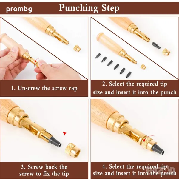 кожарска, сарашка ротационна замба с 6 накрайника, диаметър 1,5 мм; 2мм; 2,5 мм; 3 мм; 3,5 мм; 4 мм. При натиск замбата се върти и се реже материалът. Дължина на инструмента 14 смм.