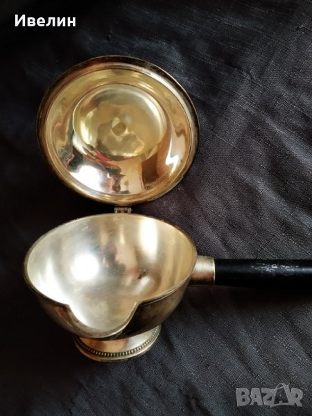 посребрен метален съд.висок е 13см,диаметър 12см,дължина с дръжката 22см..внос от франция.