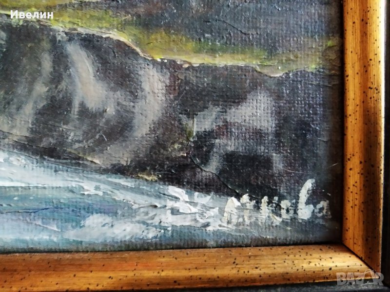 картина-пейзаж,.масло на платно,подписана на подрамка с размери 30см/40см,в рамка с размери 39см/49см.забележка-посочена е.