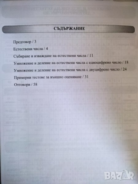 включва по 19 въпроса върху темите "Естествени числа", "Събиране и