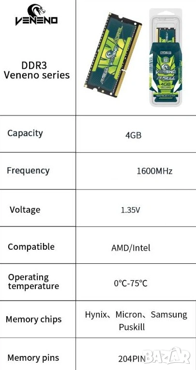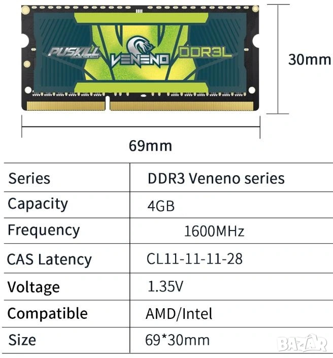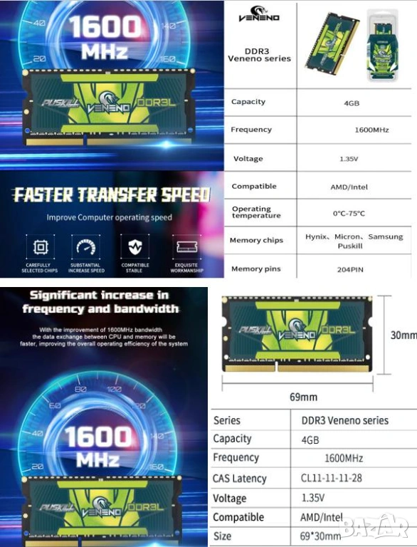 * Продукт: Puskill Veneno памет за преносими компютри 4GB Ddr3L 1600 Cl11/Cl9.