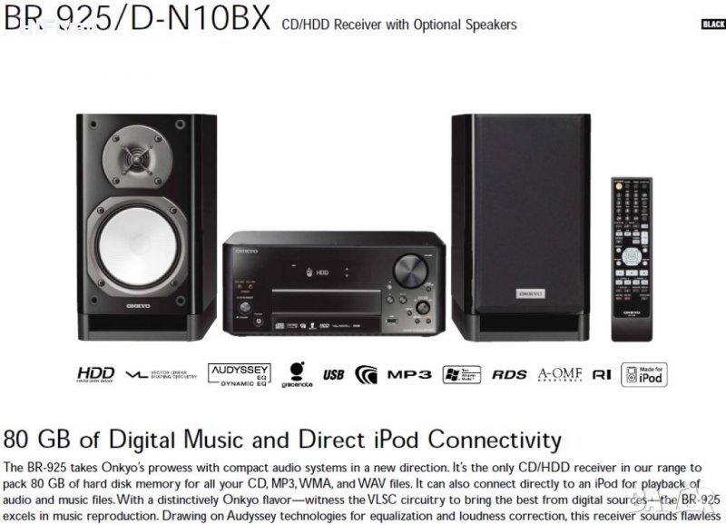 Предлаганият ONKYO BR925UKD е уникален по рода си мрежов стерео ресийвър с 80гб твърд диск, цифрово и аналогово радио, компакт диск, USB плейър. Функция запис на радиопрограми или компактдискове и много други! Сигурен съм, че познавачите са запознати и затова няма да изпадам в подробности. Все пак за повече информация и пълно описание вижте и старницата на производителя.