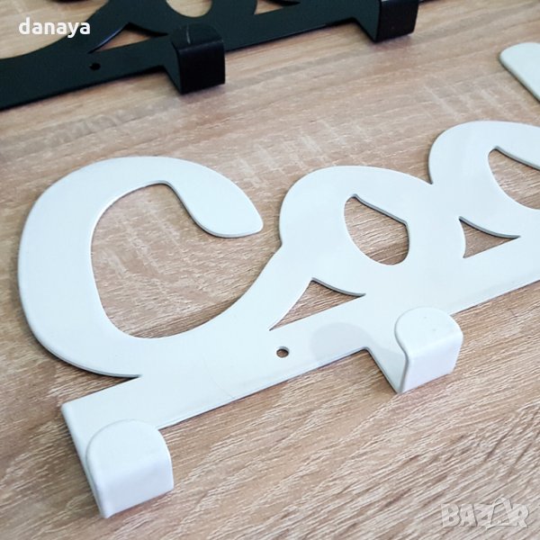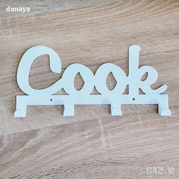 Метална закачалка за стена с тематичен надпис Cook. Чудесен декор за кухня. Закачалките се предлагат в бяло и черно. 4 куки за закачане на кухненски прибори, кърпи и други аксесоари.
