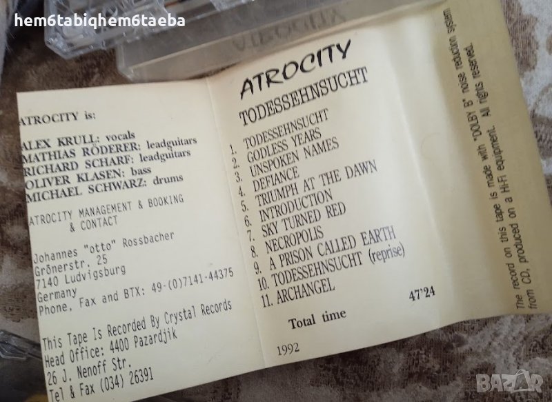Рядка касетка от личната ми колекция на ATROCITY - Todessehnsucht с разгъваща се обложка от Crystal Records. Това е най-доброто изпълнение на този албум на нашенска касета от онова време.