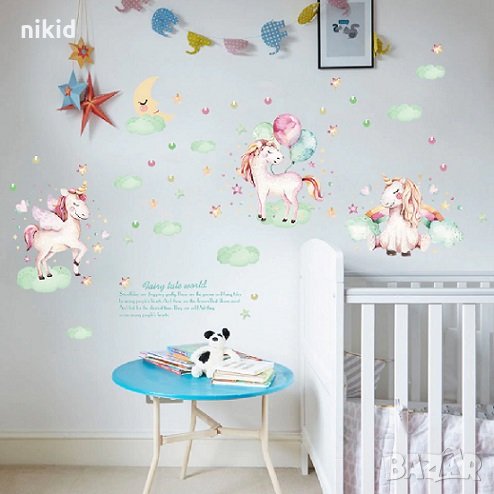 Unicorn Еднорог детски еднорози с балони самозалепващ стикер лепенка за стена и мебел детска стая → Обява 26555574