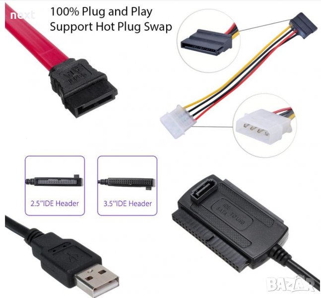 USB Кабел за връзка към диск 2.5"/3.5" SATA/IDE HDD/DVD/SSD + Гаранция