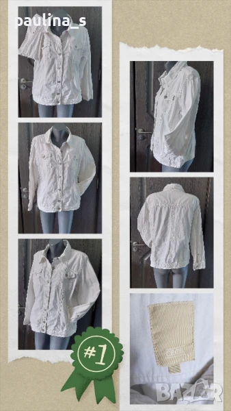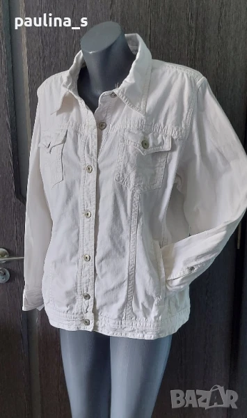 4️⃣. Колаж / XL / 2XL - Бяло дънково яке "Cecil". Цената е крайна 29,99лв / 15 евро. Платът е релефен Деним, по-скоро стои като ленен, моделът е класически, леко втален и издължен до ханша, придава изисканост и спортен стил, тегелите и емблемите са бежови, уникална дреха! Размер 44EU.
