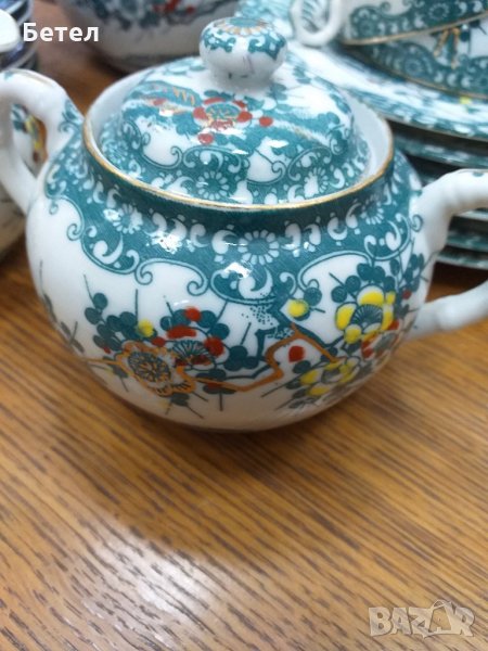 Уникален сервиз от японски костен порцелан "яйчена черупка" с прозираща на дъното глава на гейша. Състои се 20 ръчно рисувани части:Чайник с бамбукова плетена дръжка и вградена порцеланова цедка ;каничка за мляко,захарница,6 десертни и 6 малки чинии, 5 чаши. Декор в зелено и злато 24 к.На светлината прозира глава на гейша на дъното на чашката.