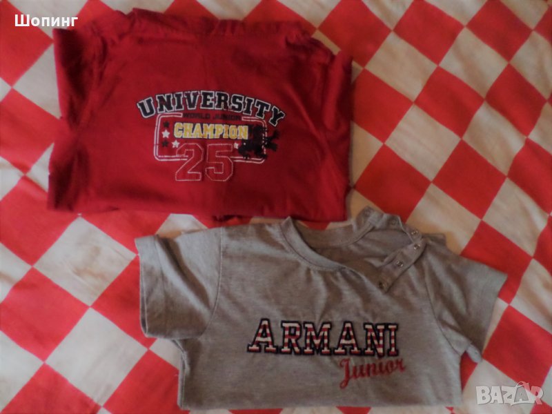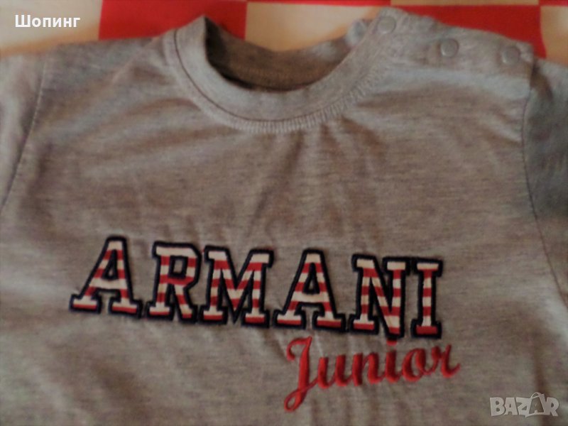 1. Комплект Армани - 40 лв. включва: - тениска с къс ръкав Armani junior - памучна, разтеглива, закопчаване с тик-так на рамото за лесно събличане и обличане. От подмишници обиколка в неразпънато състояние 67 см. Дължина 43 см.