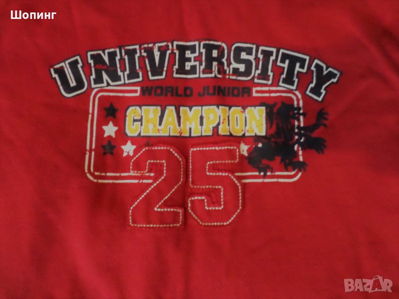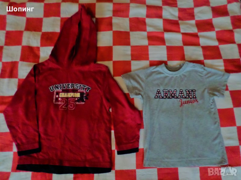 - тъмночервен суитчър с качулка - Размер 110 по етикет. Измерена през подмишници обиколка в неразпънато състояние 74 см. Дължина 46 см. 100% памук.