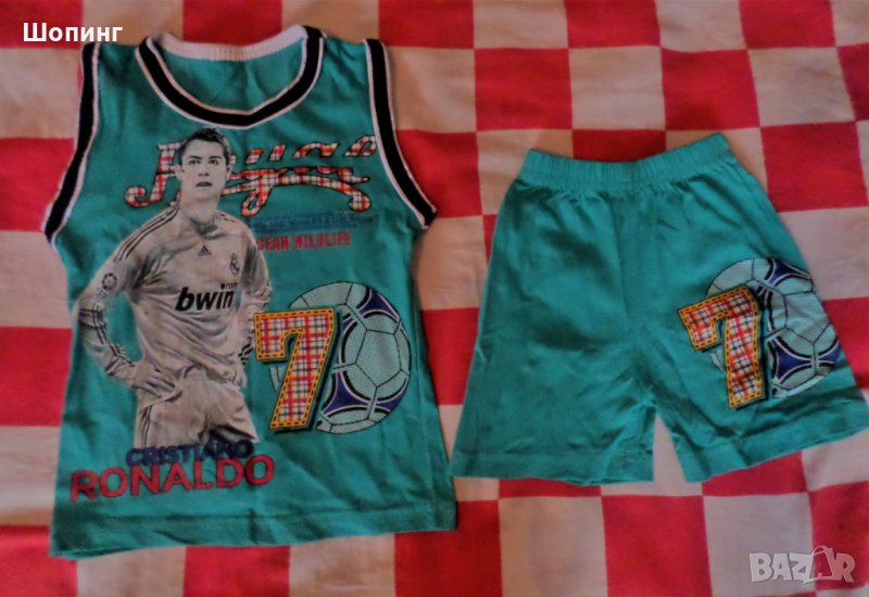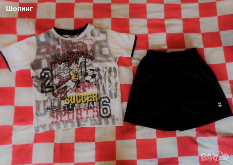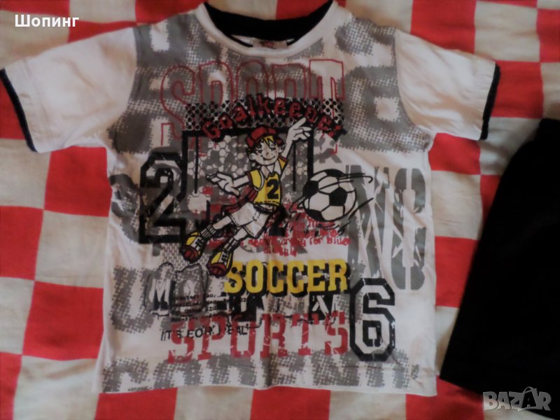 2. Комплект Футбол - 38 лв.: - тениска - Размер 104 по етикет. Измерена през подмишници обиколка в неразпънато състояние 78 см. Дължина 43 см. 100% памук.