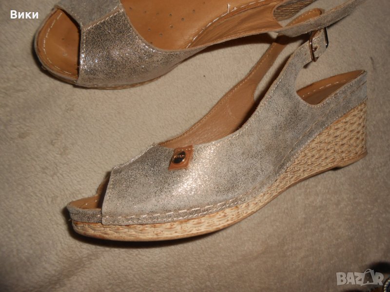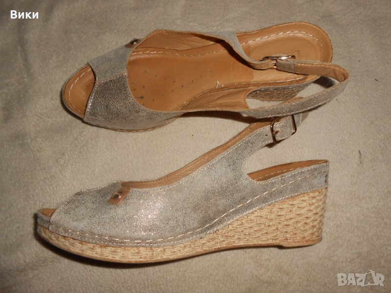 Дамски елегантни сандали на платформа от естествена кожа в бежово , сребристо , златисто ,със закопчаване;височина на ток 7 см ,Носени са 2 пъти .