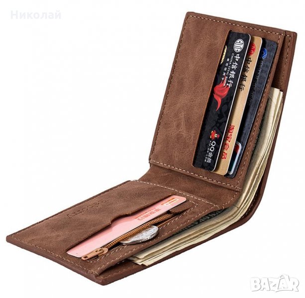 Външната част еизработена от светло кафява кожа , хастарът е изработен от синтетика . Има отделение за книжни пари и монети с цип . Две скрити отделения , отделение за лична карта и 4 места за дебитни , кредитни , банкоматни карти. Подходящ за подарък за мъже , рожден ден , имен ден и др.