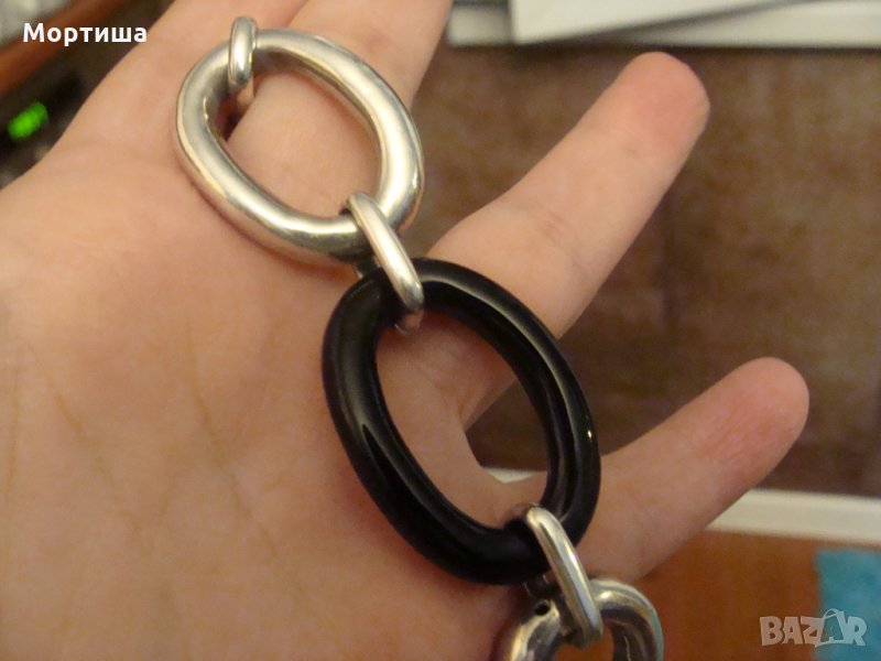 Духано сребро 925 и натурален оникс изцяло ръчна изработка рядка Тежи повече от 45 гр Дължината и е 23 см но може да се регулира Елементите са с размер 4 на 2,6 см Към нея има и висулка Носени са рядко Без забележки леки следи от употреба .Купувани са от Турция на двойно по висока цена .