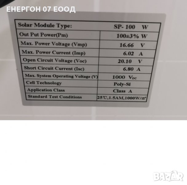 Реални 100 вата при 6,8А ток !! Най високия клас поликристални клетки ! Обърнете внимание на това какъв панел ви трябва, защото масово се продават панели по 150, 200, 250, 270 вата на които ампеража е най много 4-5А . Тяхното напрежение е много над нуждите на 12волтовата система обикновено са около 38 - 45 волта. Затова имате нисък ампераж и ненужно високо напрежение. а точно амперите са силата която зарежда акумулатора. Затова дадохме поръчка на завод - производител. И създадохме ПО НАШ МОДЕЛ- панел с високо КПД подходящ САМО за 12волтови системи. С максималния възможен ампераж - 6.8А !!! ПЕРФЕКТЕН ЗА КЕМПЕРИ ИЛИ КАРАВАНИ