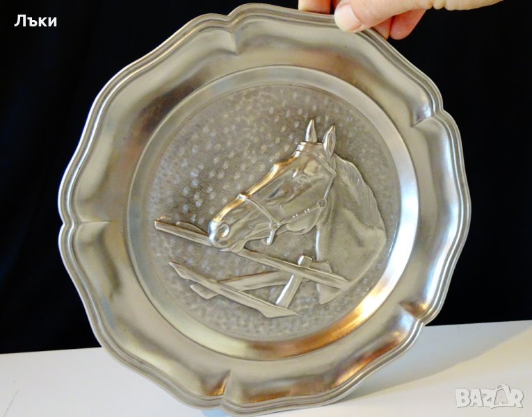 Старинна немска чиния,пано от калай с релефен кон,майсторска