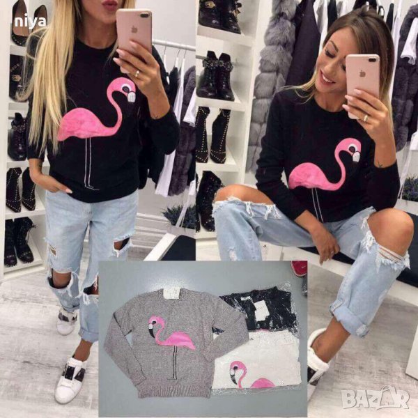 Пуловер със фламинго в черно,бяло и пудра -(С, М и Л) → Обява 26604401