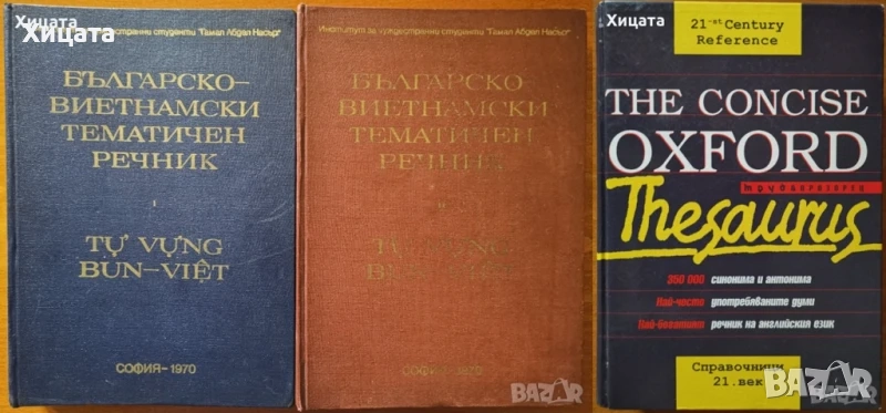 Българско-виетнамски тематичен речник.Том 1-2,Колектив,ИЧС,1970г.850стр.Голям формат! - 250лв The Concise Oxford Thesaurus,Бети Къркпатрик,Труд & Прозорец,2000г.896стр.Отлична с леки забележки! - 70лвИспанско-български и българско-испански политехнически речник / Diccionario politecnico español-bulgaro y bulgaro-español,Техника,1994г.600стр. - 80лв. Немско-български политехнически речник,Техника,1994г.1184стр.94000 термина! - 70лв.Немско-български политехнически речник,Техника,1984г.1240стр.Отличен! - 60лв. Английско-български политехнически речник,Техника,1984г.960стр.Отличен! - 50лв. Българско-гръцки речник,К.Илков, Д.К.Марицас,Ап.Михайлов,Д.И.Петкидис,Егео / БАН,1995г.1474стр. - 80лв Учебник по сърбохърватски език,Ангел Игов,Наука и изкуство,1964г.212стр.Изключително запазена! - 50лв Сербско-хорватско-русский словарь,И.И.Толстой,ГИИНС,Москва,1958г.1176стр. - 50лв Чешко-български речник,Цветана Романска,Наука и изкуство,1961г.680стр. - 30лв. Чешко-български речник,Д-р Цветана Вранска ,Университетска печатница,София,1949г.428стр. - 30лв.Parliamo italiano! Наръчник по разговорен италиански език.Част 1,Бианка Бавиери - 30лв Bulgarian-English Dictionary / Dictionary.Bulgarian practical dictionary,Ivan Tchomakov,Hippocrene Books, Inc,2004г.324стр.Отлична! - 25лв English for Bulgarians.Part 1 / Английски език за българи. Част 1 - 20лв.Практическа английска граматика,Весела Кацарова,Анна Павлова - 20лв.Справочник английска лексика и граматика,Мария Филипова,Любомир Иванов - 20лв. BBC1.Учете английски с BBC.20 урока за начинаещи,Jeremy Harrison,Летера,1993г.250стр. - 22лв