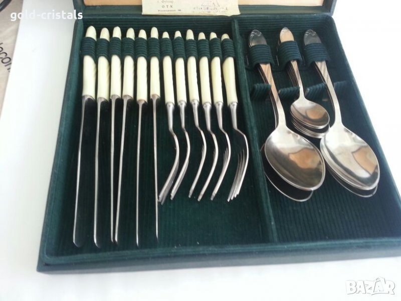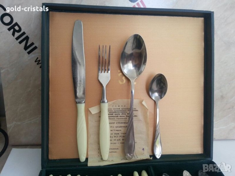 Ретро сервиз прибори за хранене в кутия неизползвани неръждаеми маркирани руски съветски ссср стари старинни антикварни арт декор винтидж колекция стари комплект сет лот ножове вилици лъжици лъжички гравирани стари антикварни предмети обзавеждане за дома и семейството подходящи за подарък за ценители и колекционери