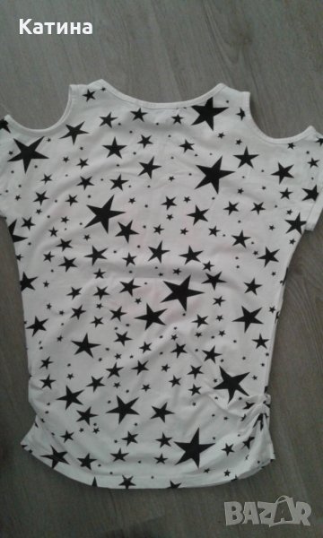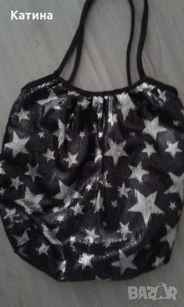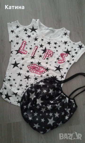 Блузка с открити рамена,декорирана с кристалчета.Размер на етикета 160 см.Нова,само е изпрана.H&M чанта-торба(текстил) с блещукаща предна част.Носена малко.В отлично състояние.