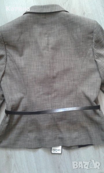 Страхотно дамско сако в меланжирано кафяво,с подплата.Интересна идея с нежен кожен колан в талията.Размер на етикета UK 14.