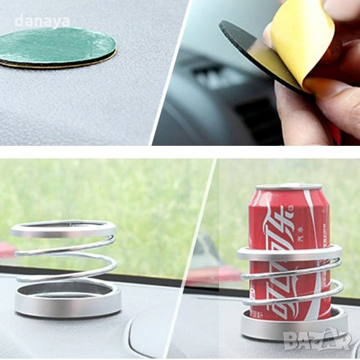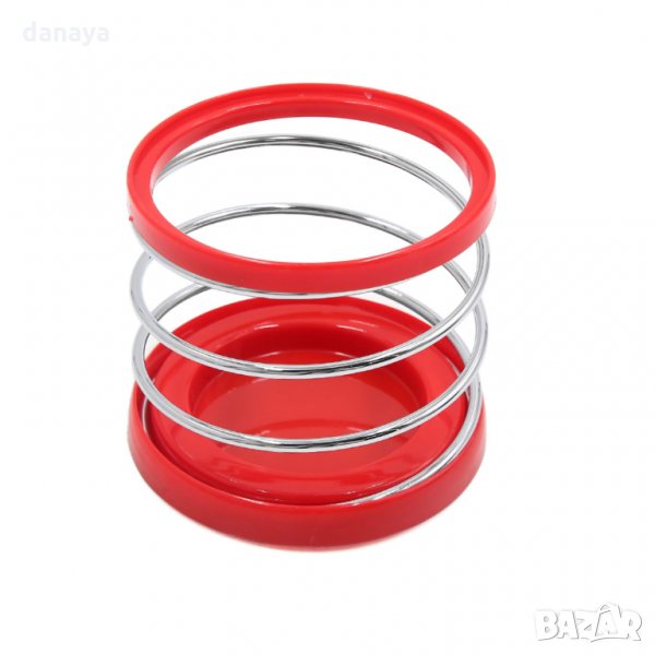 Универсална поставка за чаша за кола, тип спирала. Стойка за чаша кафе, чай, бутилка от 500ml или кен. Поставя върху таблото на автомобила с помощта на двойнолепеща лепенка, която е включена в комплекта. Поставките се предлагат в различни цветове.