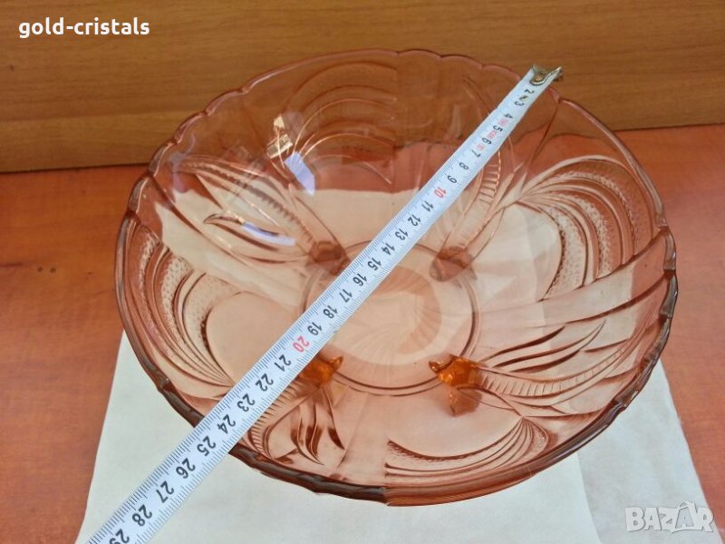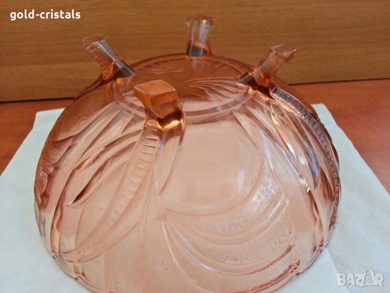 Кристална купа фруктиера без забележки ретро арт деко винтидж колекция стъклена без забележки на четири крачета цветно стъкло тъмно розово цветно стъкло масивна и тежка гравирана стари антикварни предмети обзавеждане за дома и семейството подходяща за подарък за ценители и колекционери