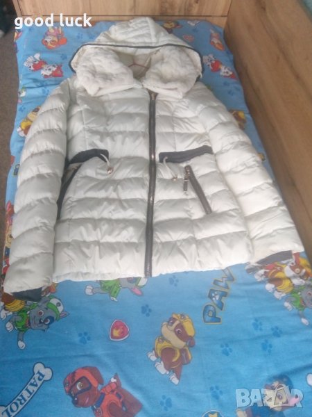 Красиво бяло яке с черен страничен цип и с качулка,размер Л,за 45 лв. → Обява 26628248