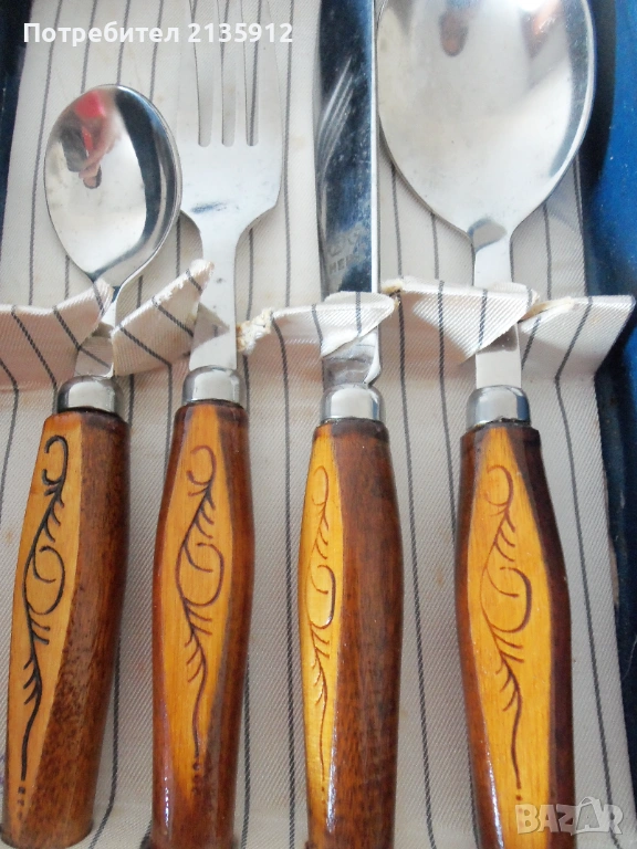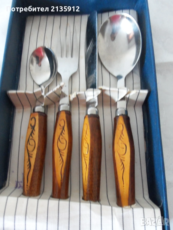 1.Комплект нов с прибори за хранене от неръждаема стомана по 1брой с дървени лакирани дръжки, цена 10 €.