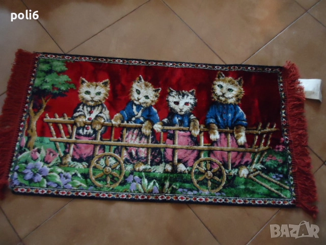 ковьор,пано,килимче,покривка,не ползван, с етикета ,от плюш ,много красив с котки в каруца размер 95/51см цена 20лв//