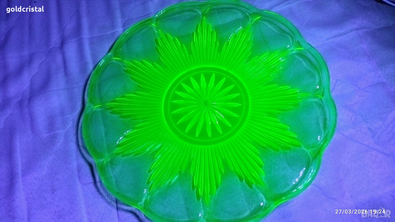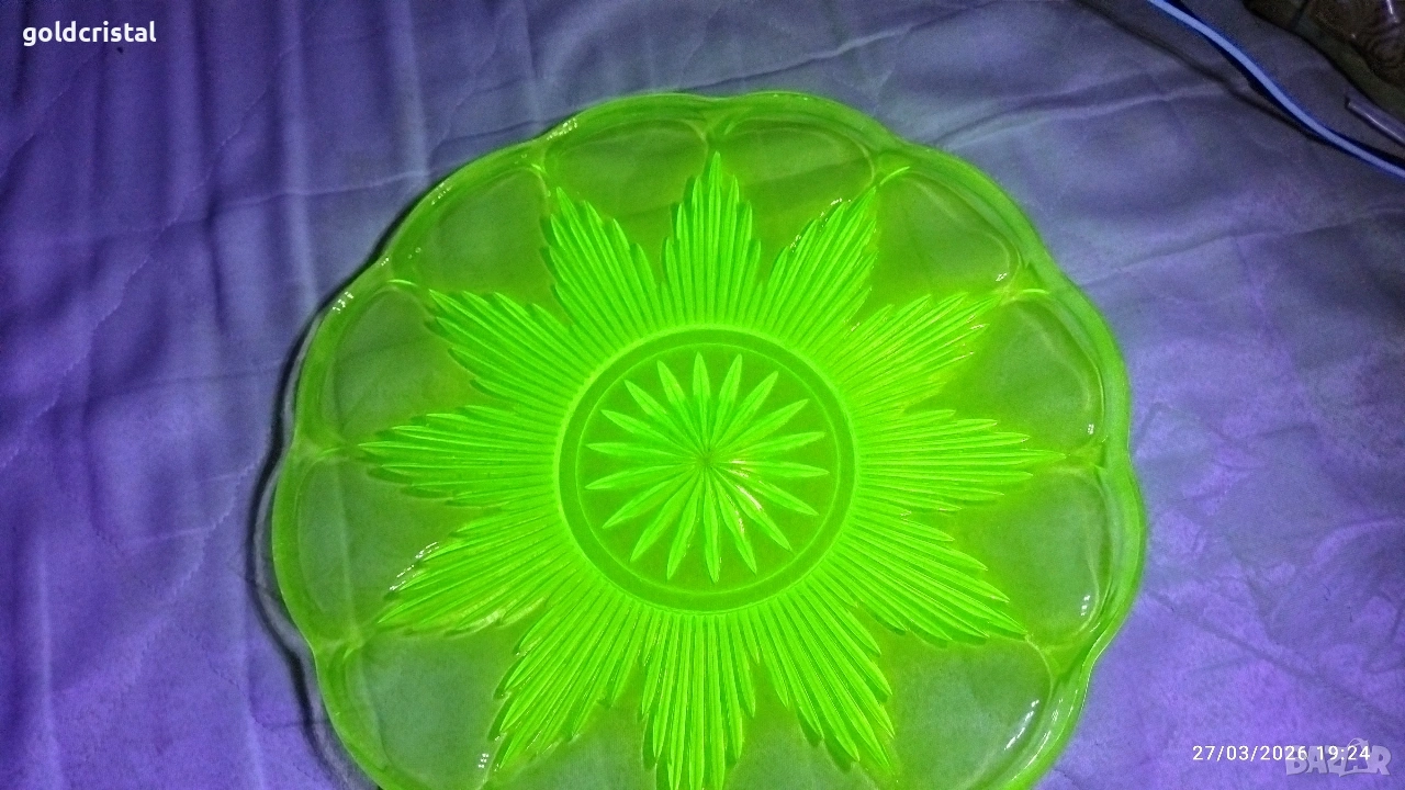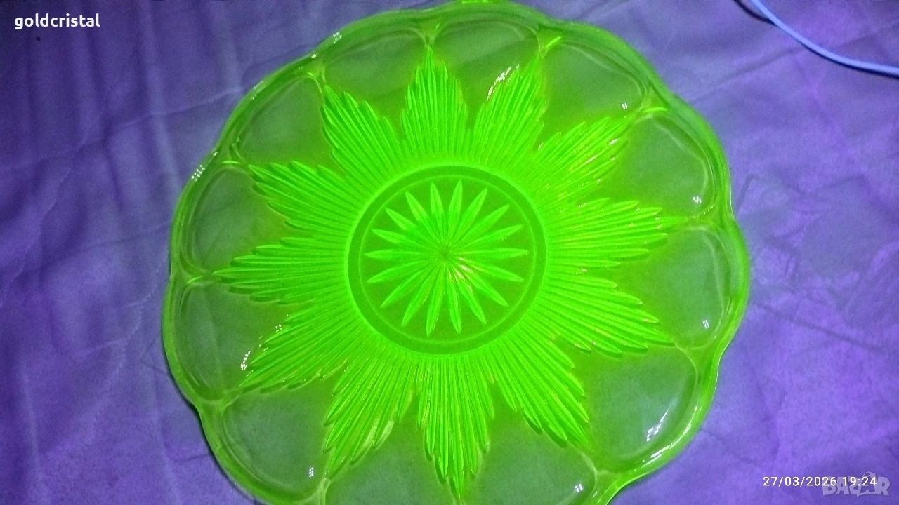 ретро стъклено плато поднос ураново стъкло кристално цветно стъкло жълто зелено неупотребявани без забележки сервиз комплект сет лот стари старинни ретро арт декор винтидж колекция стари антикварни предмети обзавеждане за дома и семейството подходящи за подарък за ценители и колекционери
