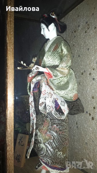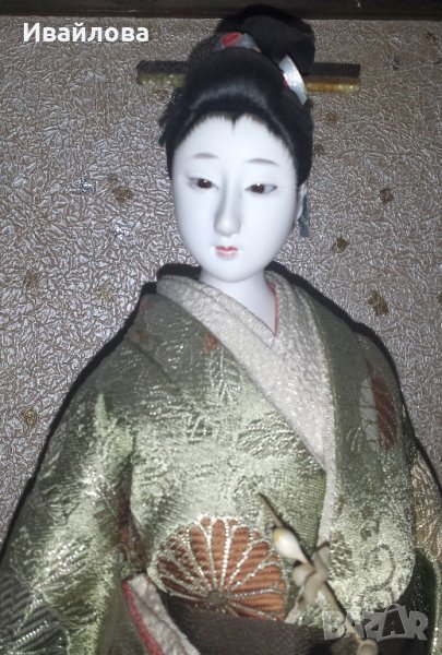 Традиционна японска кукла гейша , облечена в кимоно, изработено от коприна. В ръката си държи клонче от червена и бяла слива - японски символ на красотата.