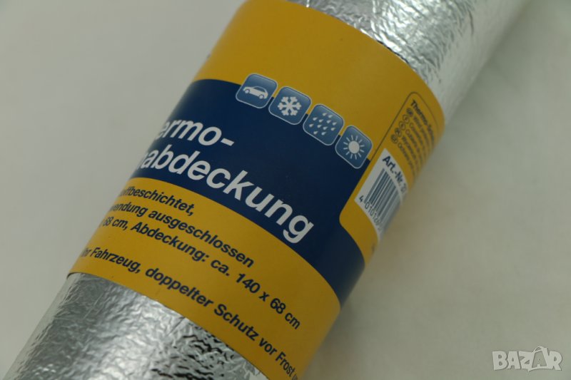 предпазно термо фолио / протектор за предно стъкло, немско, внос от Германия, FILMER. Предпазва от нагряване на интериора през лятото и замръзване на прозореца през зимата. С алуминиево покритие, подсилено с влакна. Размери: mm 1400/1900 x 680. Материал: алуминиево покритие, термоизолация. Прикрепя се с ластик в единия край и крилца от късите страни. Тегло 0.72 кг. Устойчив на замръзване, сняг и UV лъчи