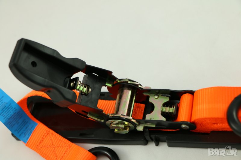 ремък с тресчотка, 5 м, нов, внос от Белгия. Ширина 25 мм, дължина 5м. Еластичност по-малко от 7 %, оборудван с 2 стоманени куки от двете страни с гумирано покритие. Тресчотка с автоматично заключване и система за бързо освобождаване. Допустимо натоварване на опън - 350 кг.