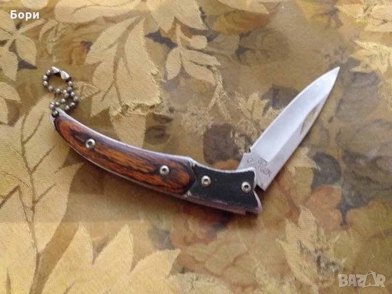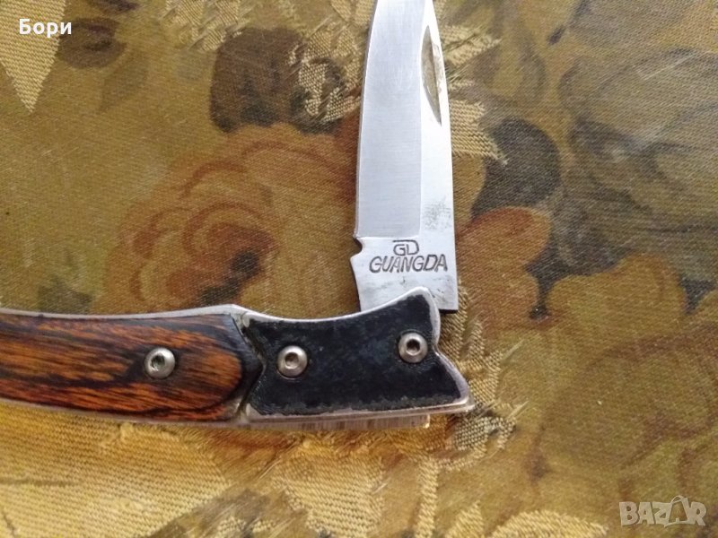 Ножче от подсилена стомана ,GUANDGA Дръжка декоративна украсена с дърво захванато с винтчета,може да се разглобява и почиства,Острие-6см,Цяла дължина-15см.Отваряне и затваряне с нормално щракане за марката.Няма хлабаво и разбито между дръжката и острието.Фабрично наострено.