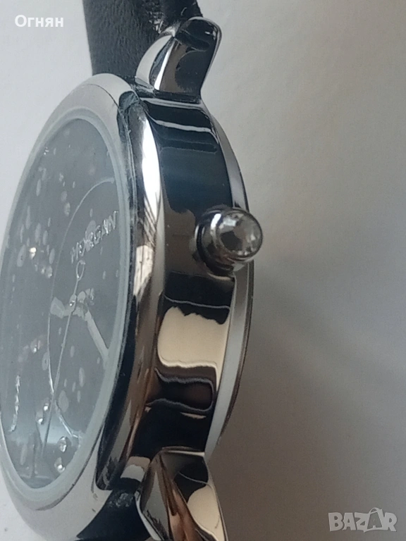 Диаметър 32мм, Корпус от неръждаема стомана , циферблат в черно с индекси с циркониеви камъни в червено и прозтачно. Корона с камък .