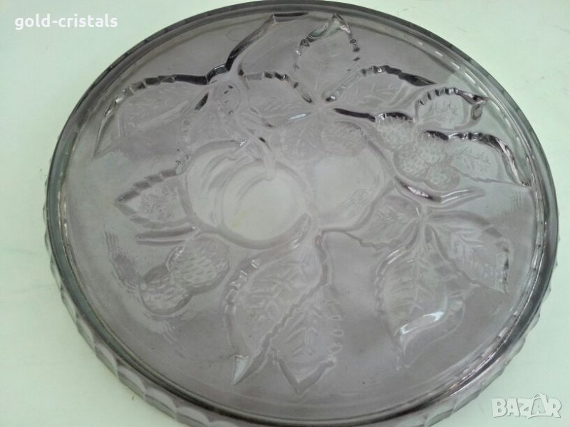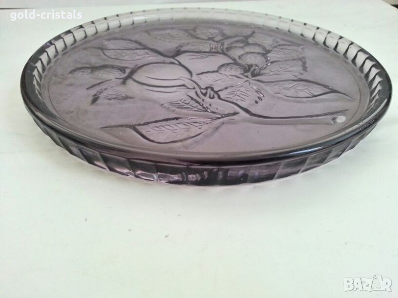 Антикварна чиния поднос плато ордьовър цветно лилаво стъкло масивно и тежко гравирана неизползван без забележки стар старинен ретро арт декор винтидж колекция стари антикварни предмети обзавеждане за дома и семейството подходяща за подарък за ценители и колекционери