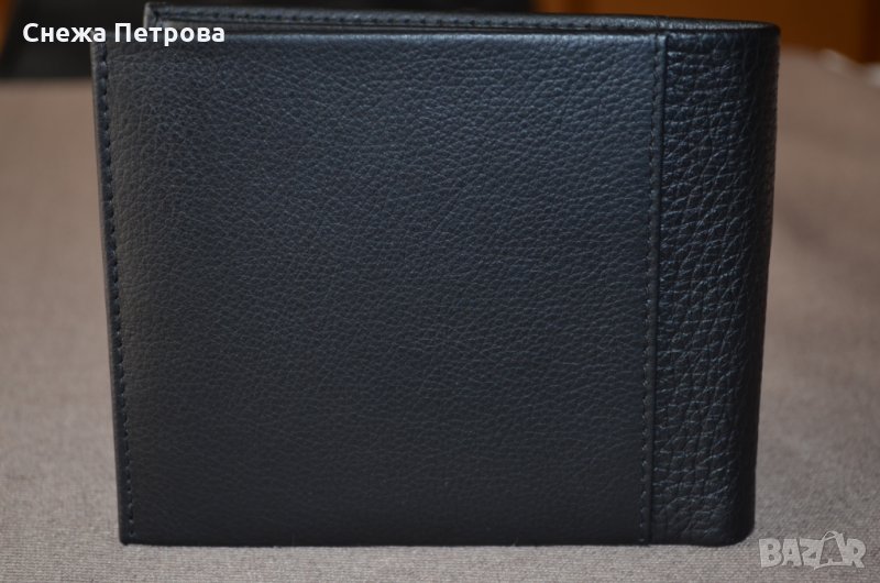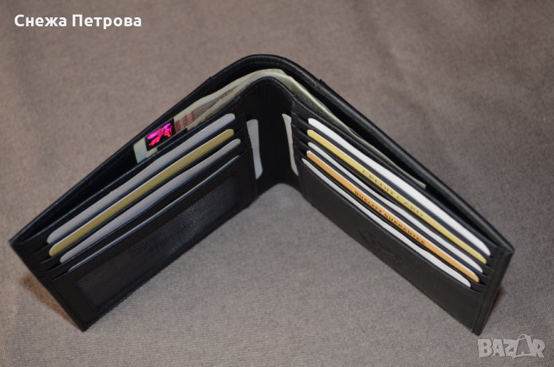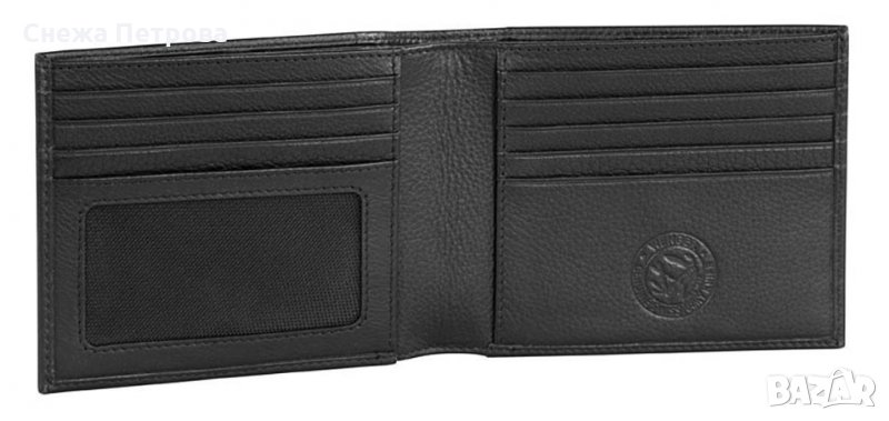 -без отделение за монети е. Надпис на фирмата отпред на портфейла и лого от вътрешната страна на портфейла. Прешито лого в едното отделение за банкноти. Размерите са следните: