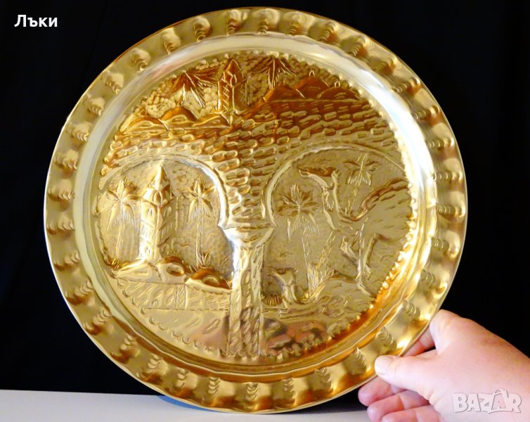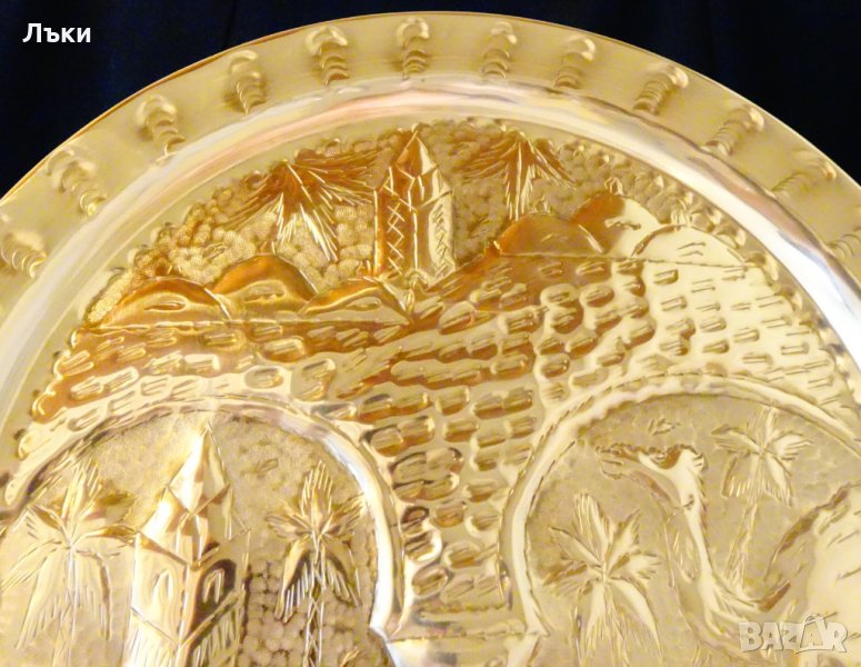 Старинно ориенталско пано,плато,синия,майсторска ръчна изработка от блестящ месинг.Ръчно ковано с изображение на приказни дворци,камили,палми и разнообразни орнаменти.Има окачалка за стена.Диаметър 34 см.,височина 2.5 см.,тегло 470 гр.