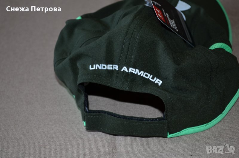 Размера на шапката по етикет е OSFA което данни на фирмата се равнява на 22-23½ в инчове. Модела е Under Armour Shadow 4.0 Cap, а цвета е Тъмно зелено с електриково зелен кант и мрежички отстрани по етикет е Artillery Green (357) / Vapor Green
