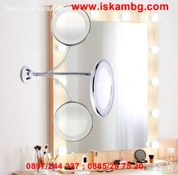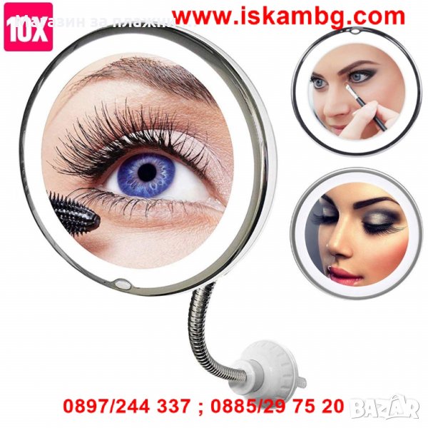 Кръгло огледало поставено върху гъвкаво метално рамо, огледалото е с LED светлини за гримиране, така се виждат и най-малките детайли, това е точното решение за вас ако все не можете да намерите начин и място на което да се гримирате. Гъвкавата стойка която се върти във всички посоки завършва с вакуумен захват, може лесно да прикрепите огледалото към някаква гладка повърхност като плочки, стъкло, гладки плотове и др. Така лесно ще използвате и двете си ръце при гримиране. Дължина на рамото - 20 см. Огледалото е с диаметър 20 см. и само 3.5 см. дебелина. Доброто LED осветление е от ключово значение за хубав грим, по края на огледалото има вградена LED осветителна лента. Осветлението гарантира перфектна видимост. Моделът, който ви представяме покрива всички нужди на всяка заета дама. Огледалото е с 10 пъти увеличение на образа. Материал на изработка - пластмаса+метал.