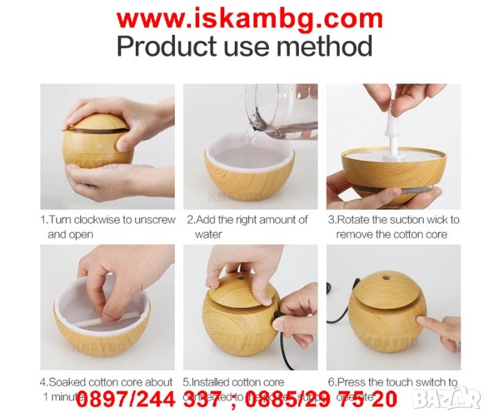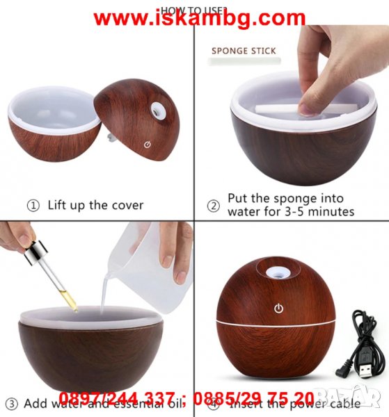 Единственото нужно е да поставите малко количество вода в контейнера, да сложите няколко капки от любимия си аромат или етерично масло и да натиснете бутона. Устройството разпрашава течността, без да я нагрява, като така запазва максимално ценните качества на етеричните масла.