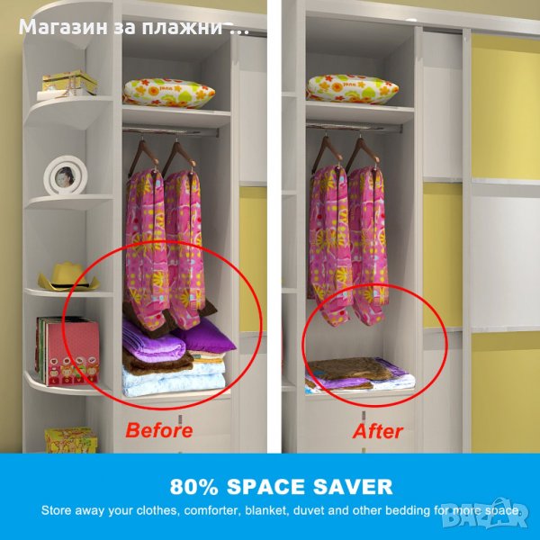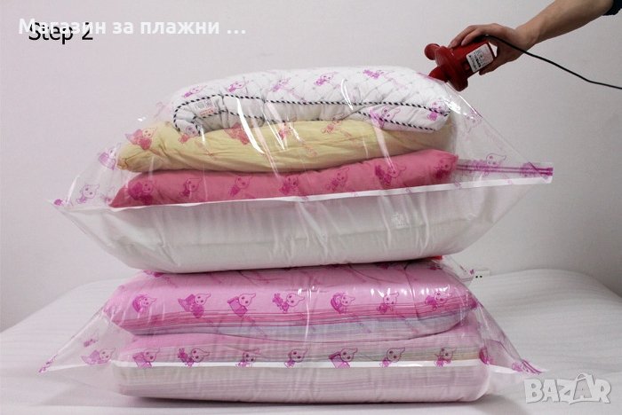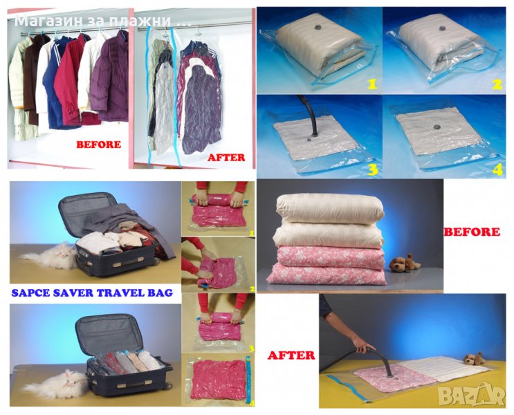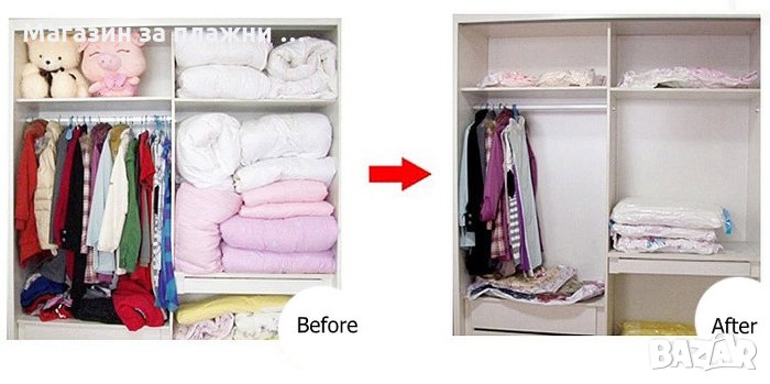 Практичен вакумен плик. С него бързо и лесно ще въдворите ред в претрупаните шкафове и гардероби. С вакумният плик ще освободите много място. Лесен за употреба. Запечатвате и изсмуквате въздуха с прахосмукачка.