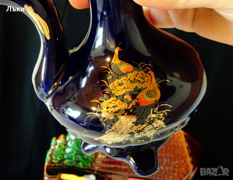 злато.Изобразена е двойка пауни от злато,сред пъстри цветя.Ефектен дизайн,блясък и финес.Височина 19 см.,дължина 15 см.,диаметър 11 см.Вместимост 400 мл.