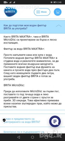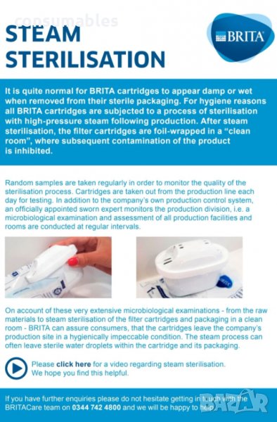 Моля имайте предвид, че ако в опаковката на филтъра ви има влага или дори капки вода, това е напълно нормално заради процеса на стерилизация през който преминава всеки един филтър, преди да бъде фабрично опакован в производствения цех на Брита. За повече информация на снимка 4 или на адрес