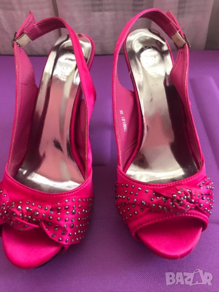 Розови(цикламени) обувки,много нежен цвят,удобна извивка на стъпалото .Височина на тока - 10 см.на платформата отпред - 3см, номер 38.Обувани за няколко часа по повод,състояние като нови.