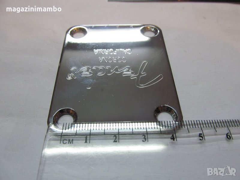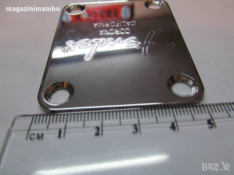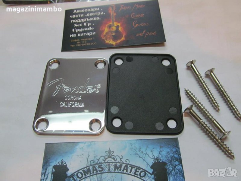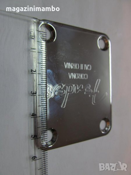 Плочка(Neck Plate) с лазерно изписано лого Fender Corona California,изработена от стомана в комплект с подложка и винтове